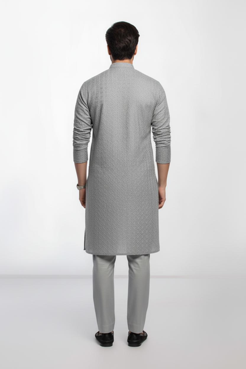 Silver Grey Men's kurta Pajama Embroidered (Chikan Kari)