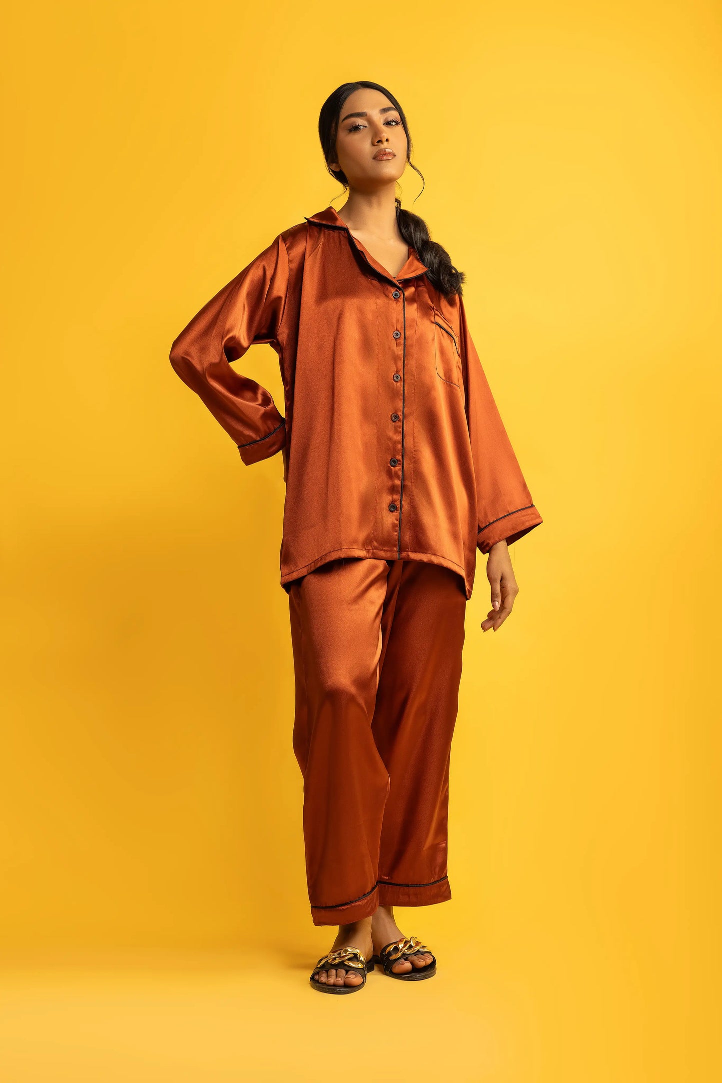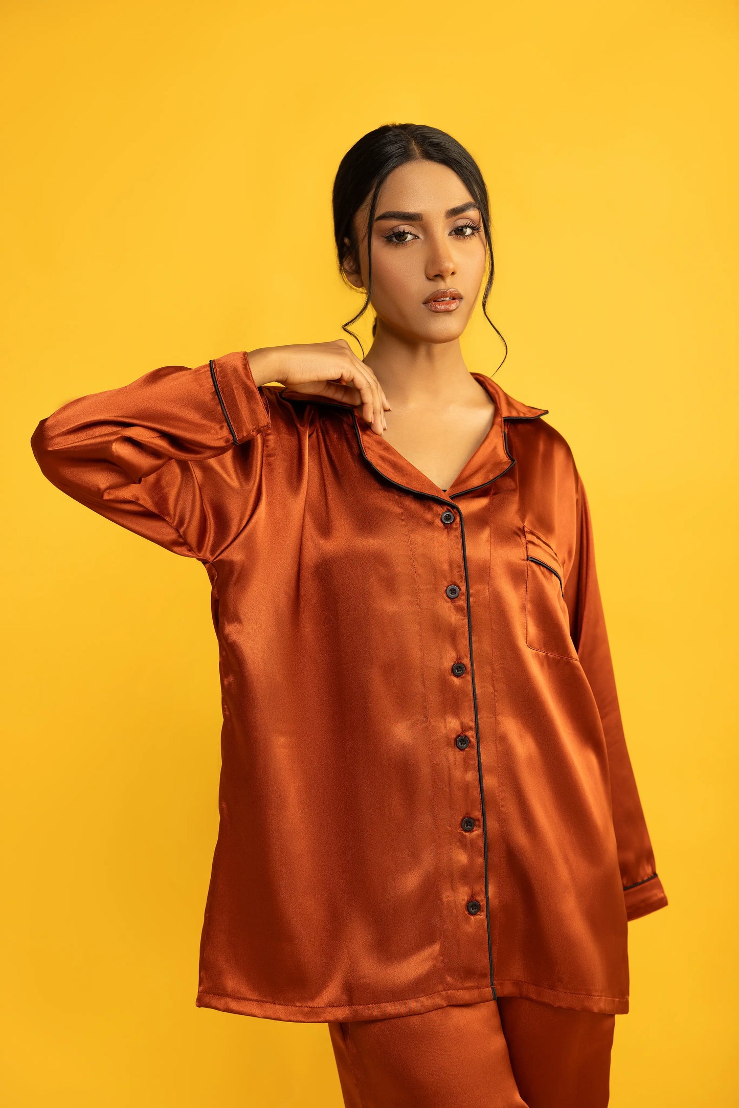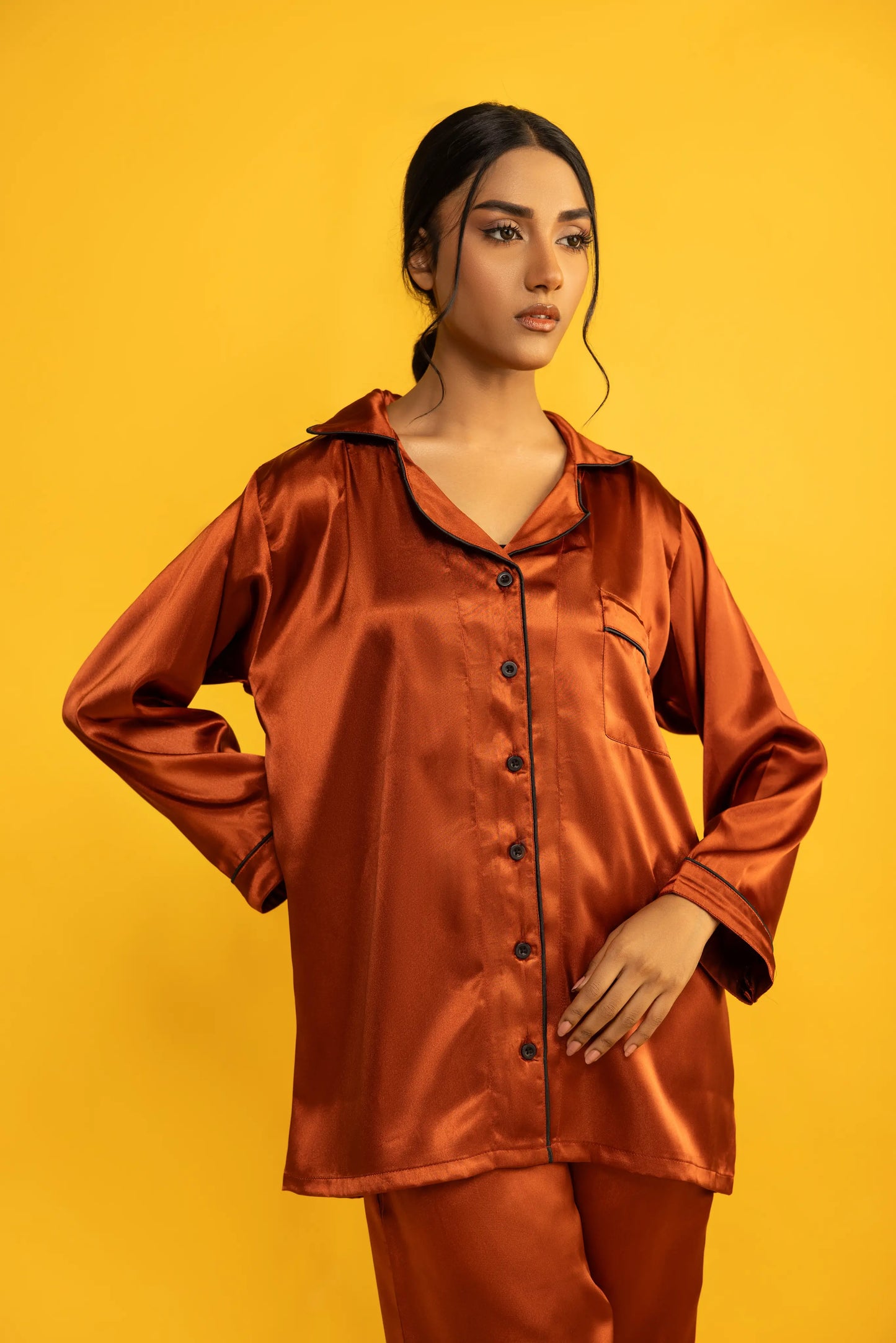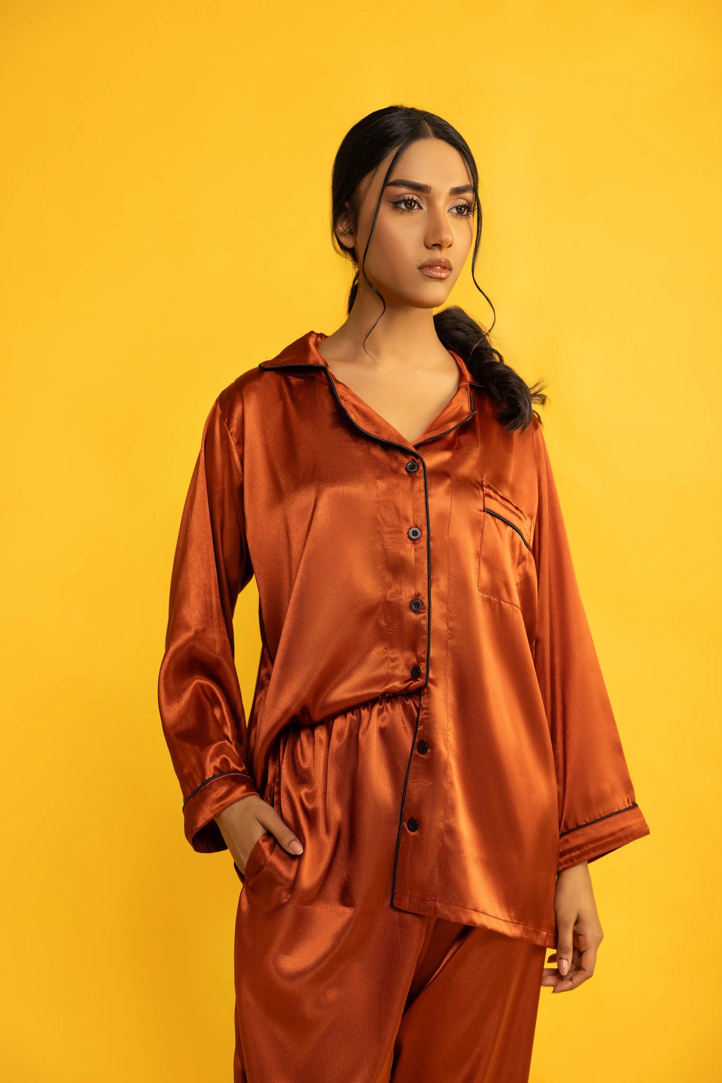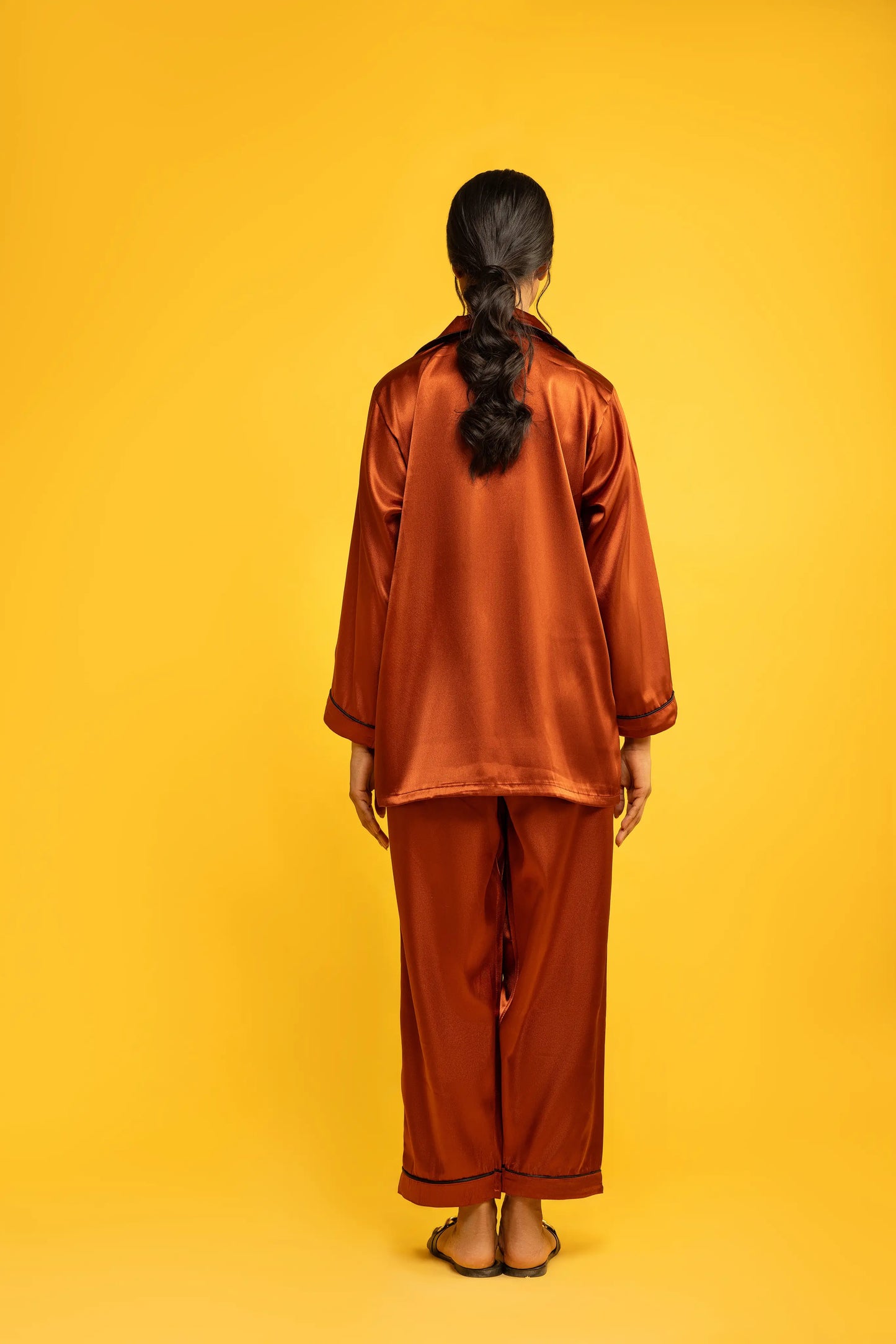 Rust Silk Satin Women‘s Pajamas Set Notched Collar Top & Wide Leg Long Pants 2 Pieces Loungewear