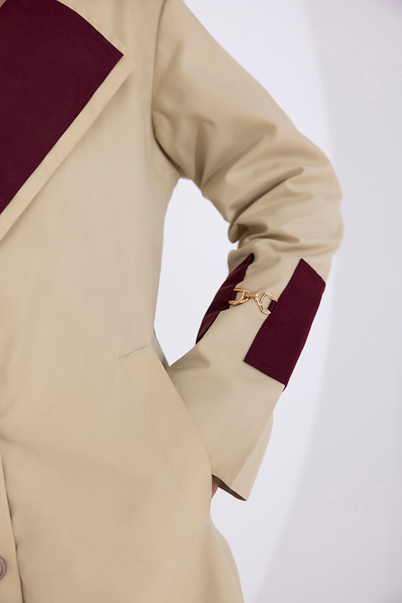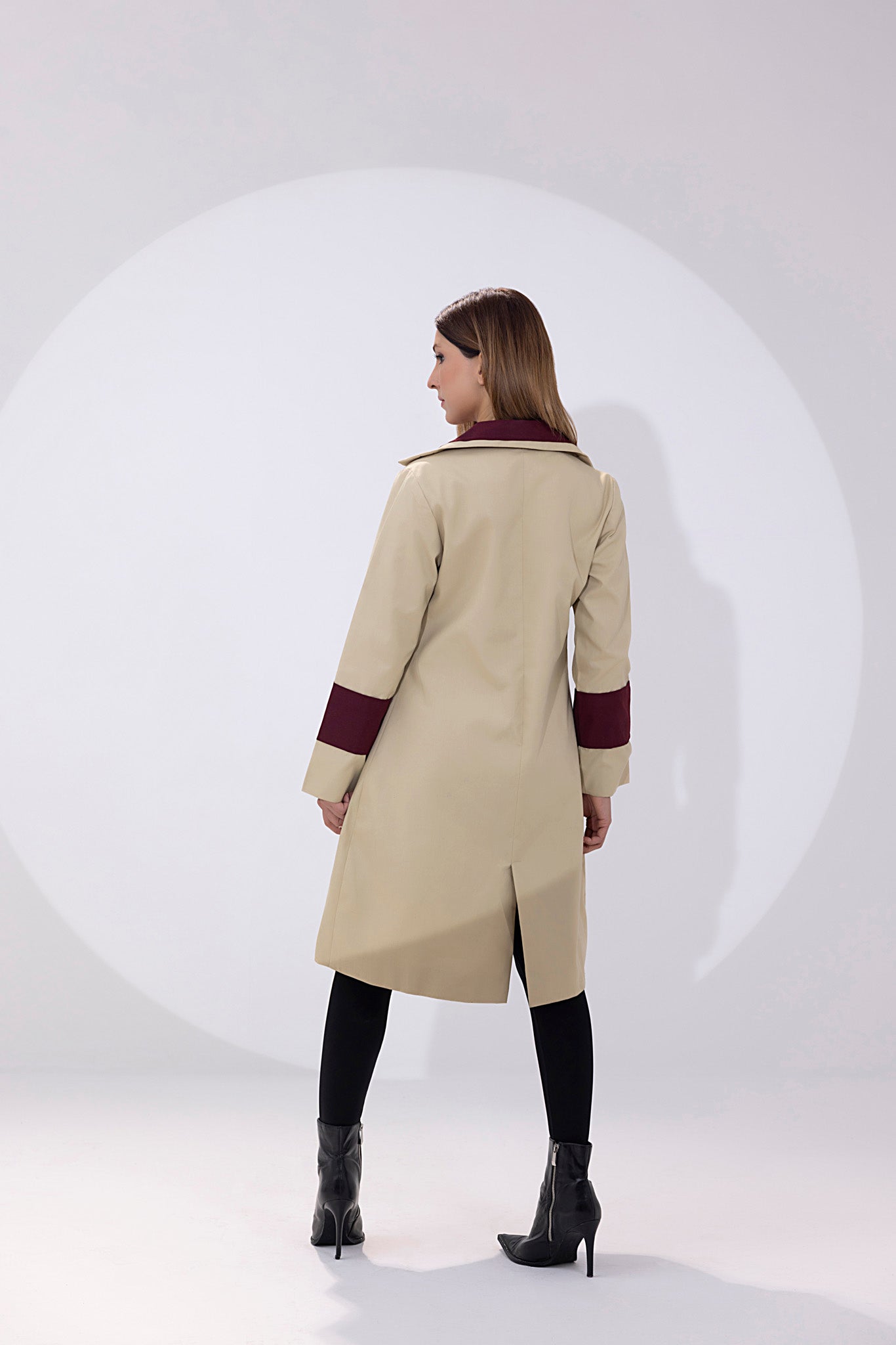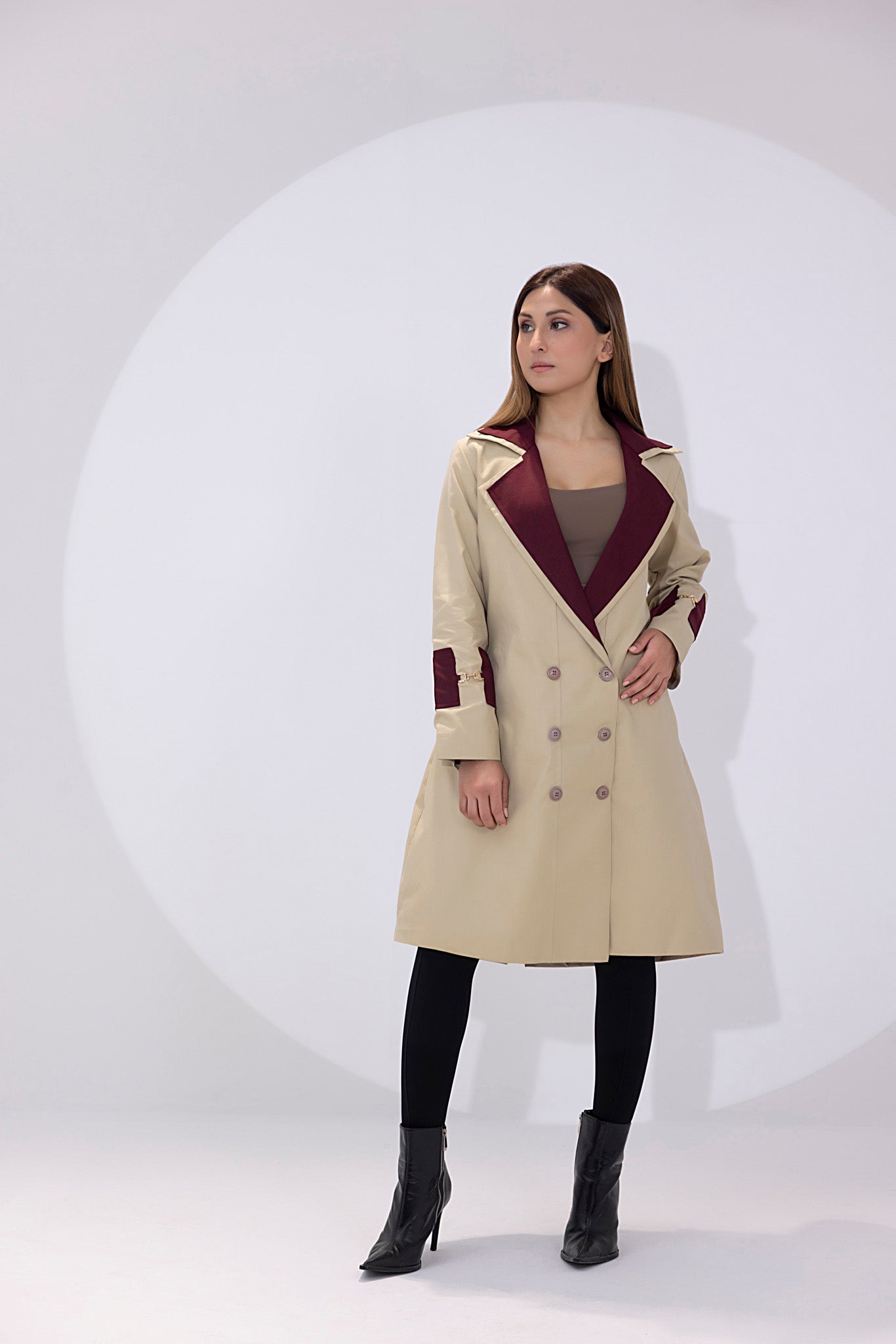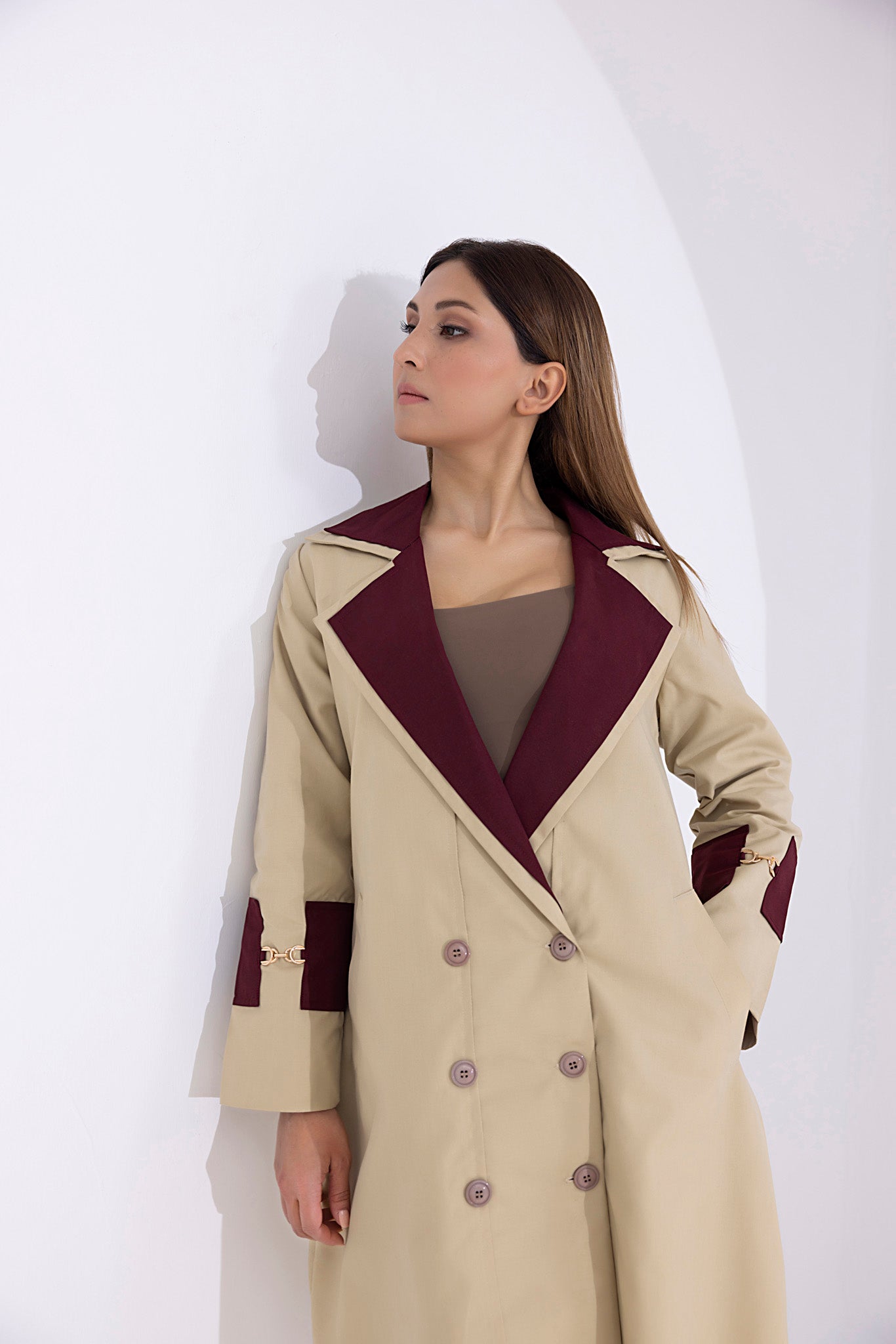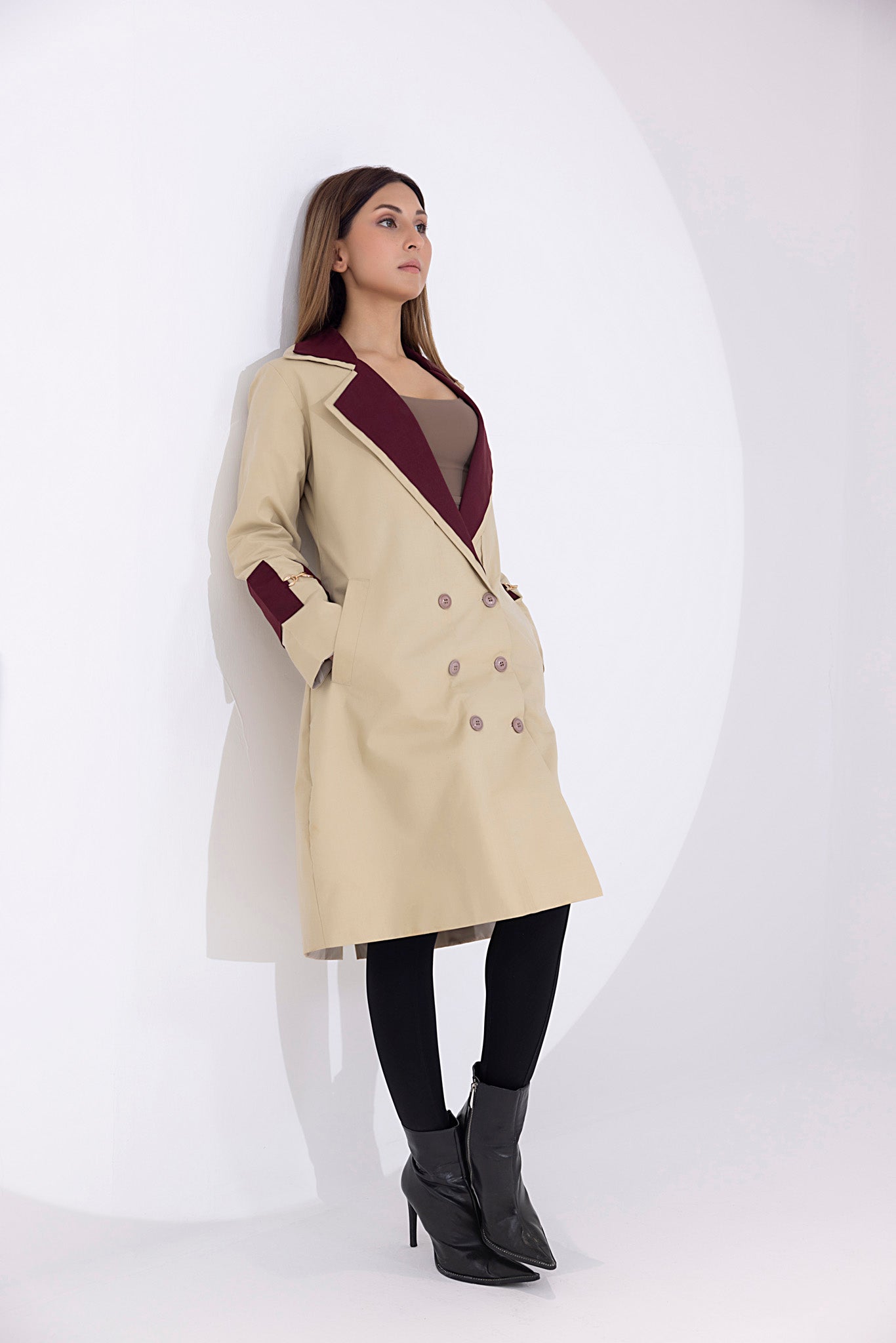 • Elegant Design: Light brown hue with maroon lapel and cuffs, double-breasted style, tailored silhouette, and adjustable belt for a flattering fit.